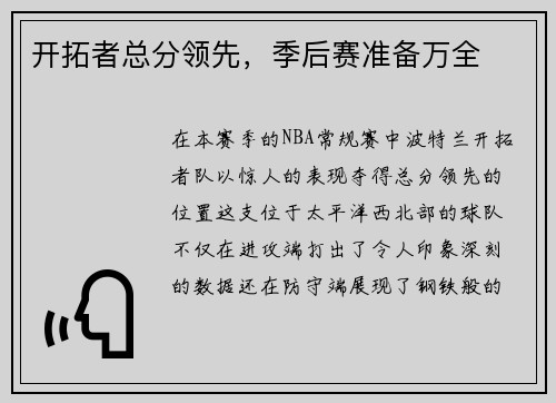 波特兰开拓者队的季后赛之路注定充满挑战,但正是这种挑战激励着球队更加努力拼搏。球队已经为即将到来的每一场硬仗做好了充分的准备。无论是面对联盟中的强敌,还是与状态出色的对手交锋,开拓者都将以无畏的精神和精湛的技艺迎接每一次考验。
